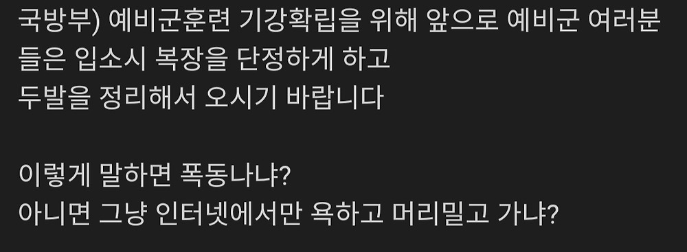 예비군 끝났지만 1년 중에 고작 일주일 남짓의 기간을 위해 그 외의 일상을 희생하란 소리잖아. 폭동이 아니라 살인 안나면 다행이지.