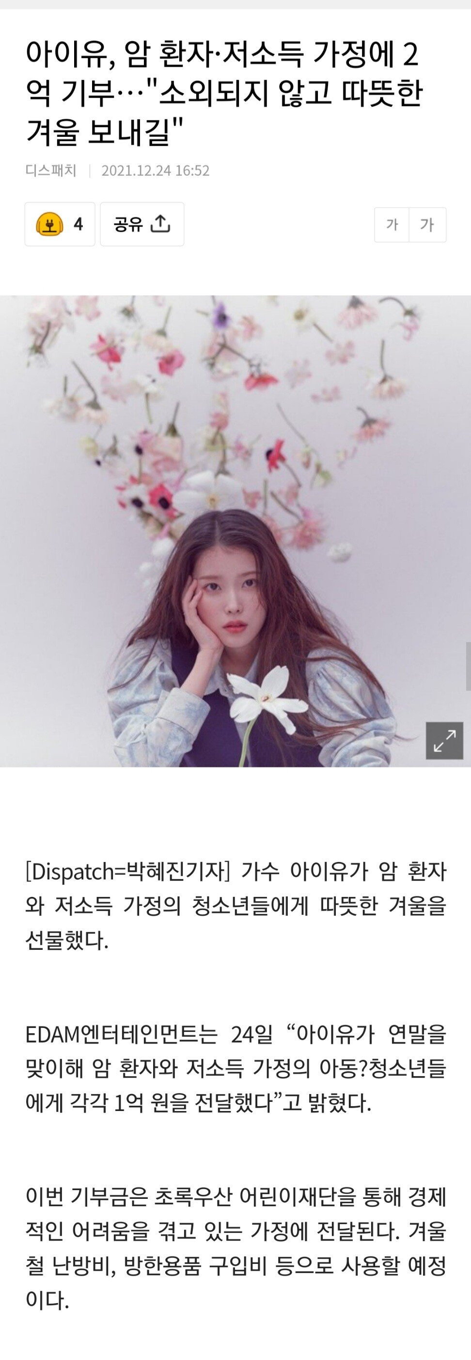 [유머] 아이유 암환자·저소득 가족에게 2억원 기부