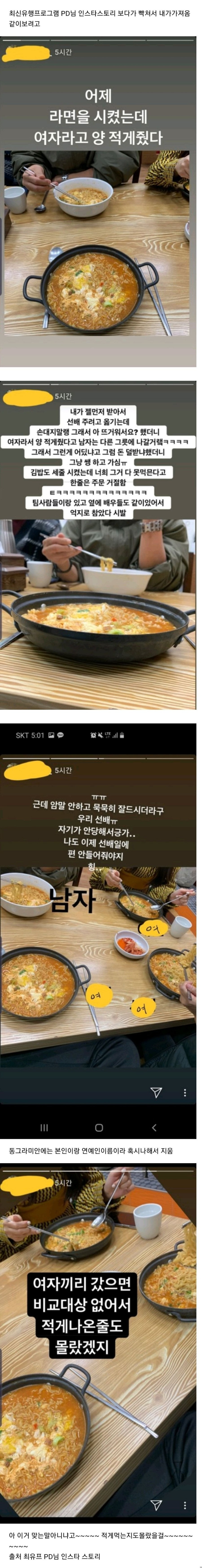라면 족히 2개 정도? 1개반? 꽤 많아 보이는데. 진짜 저대로 말했는지는 둘 다 얘길 들어봐야알고...