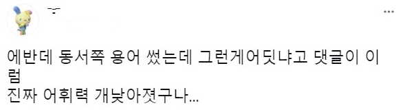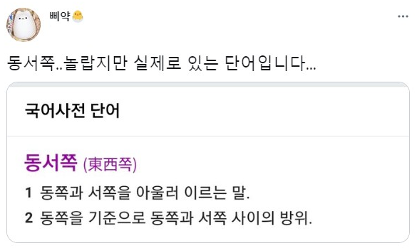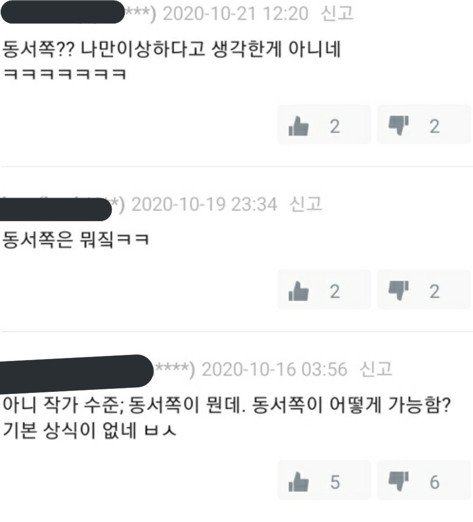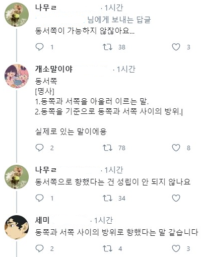 단체로 뇌가 맛이 가버린건가. 동서쪽 이란 말은 있음. 사전에 나온 의미대로. 근데 저건 소설이고, 방향을 나타내는 문장인데 동서쪽이란 문법은 나올 수가 없지. 남서쪽이에요 북동쪽이에요 라고 명확하게 진행방향을 제시해줘야지. 동서쪽은 뭐 반은 동쪽 반은 서쪽가잔 소리냐. 사전에 나온 의미에서 2번의 문맥을 쓰는거면 그냥 북쪽이다 남쪽이다 하면 되는거고