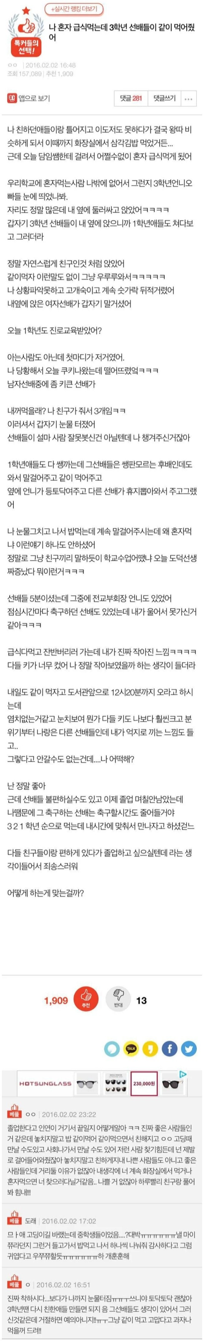 [유머] 혼자 밥 먹는데 선배들이 같이 먹어줬어