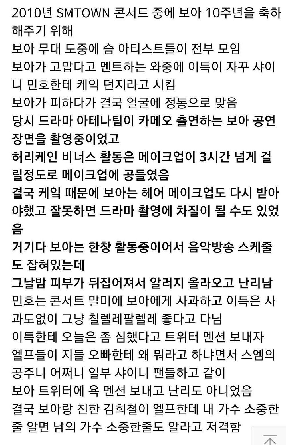 잘못은 이특이 한게 맞는데 끝까지 아닌척 했고, 던져서 케이크 묻힌 민호는 진짜 죽을상 되어서 사과했었다고 함. 보아 >>>>> 슈주 >>> 샤이니 순으로 짬이 있으니 그럴 수 밖에.