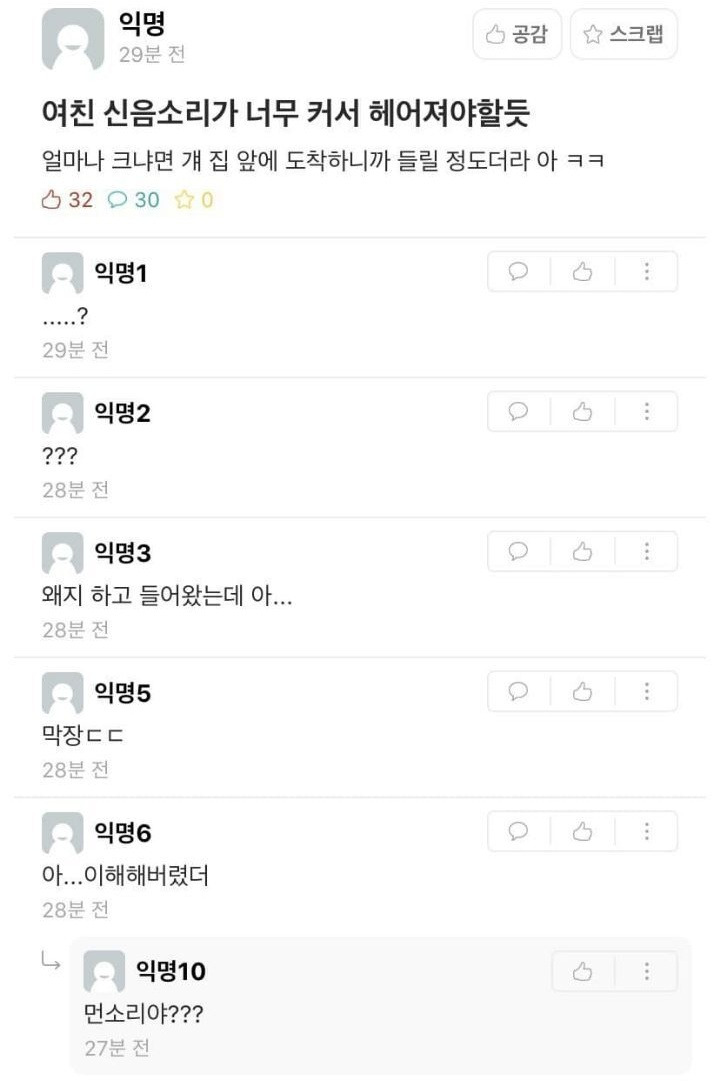 [유머] 여친 신음소리가 커서 헤어져야할듯