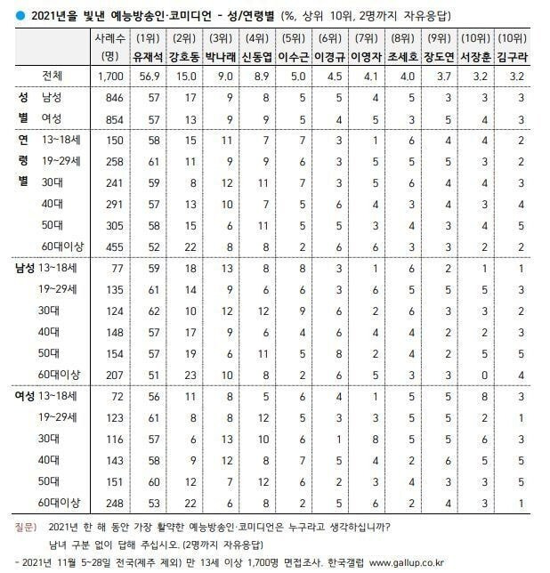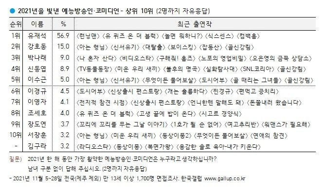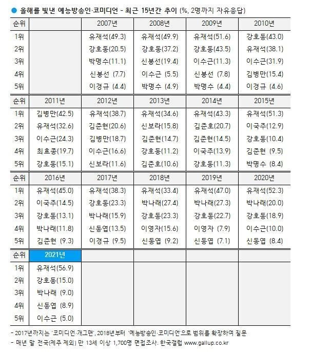 [유머] [갤럽] 2021년 올해를 빛낸 예능방송인·코미디언