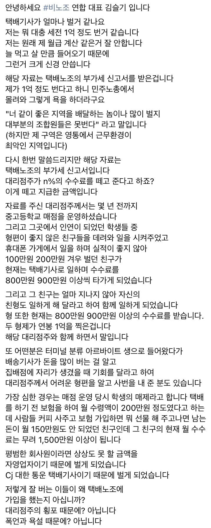 [유머] 택배 비노조연합 대표 김슬기의 글