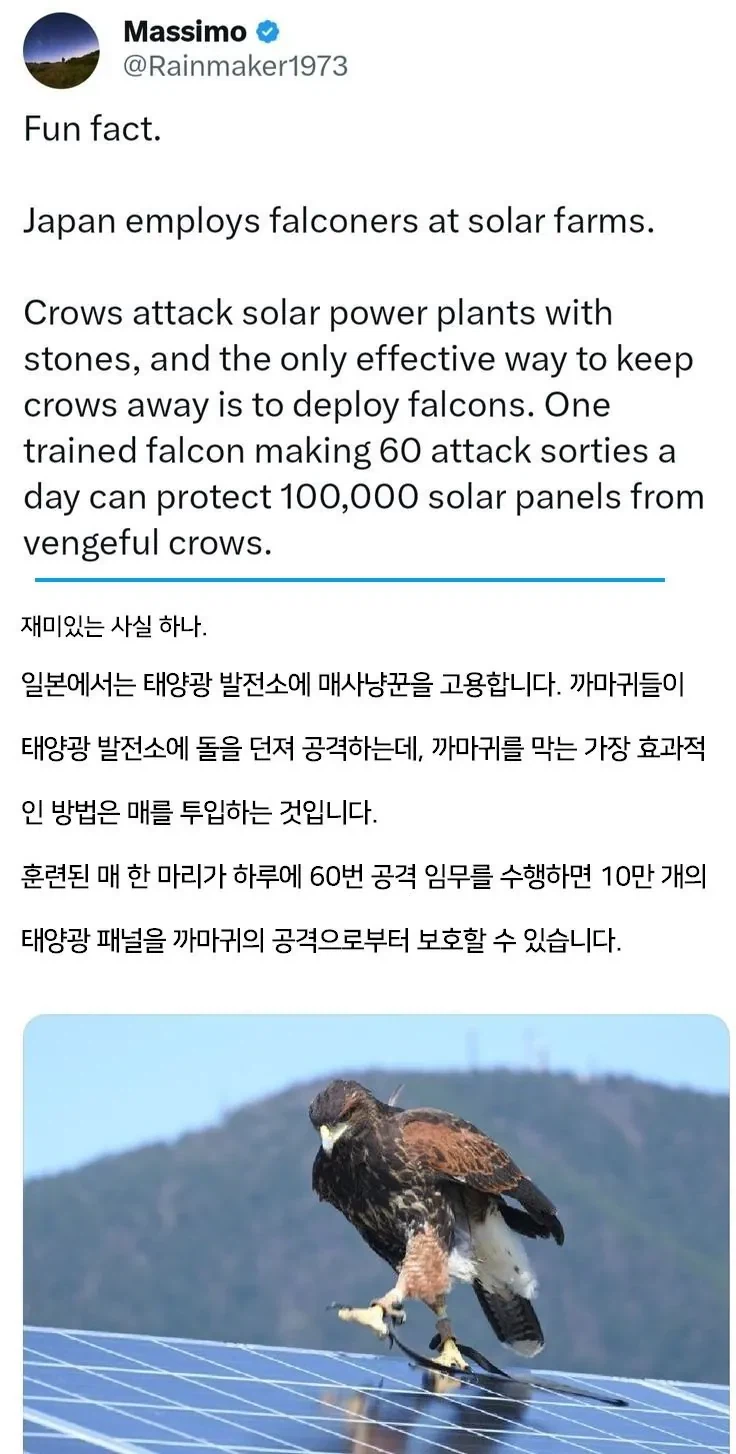 [유머] 일본의 태양광 발전소에서는 매사냥꾼을 고용합니다