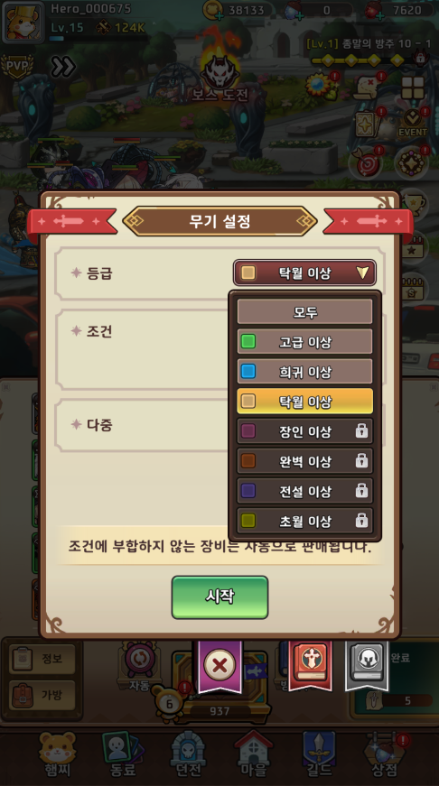 또 진행 중에 얻게 되는 장비는 설정에 따라 자동 판매도 가능한데요. 원하는 등급과 세부 조건을 정해놓으면 일일히 판매할 필요 없이 정리되며 원하는 장비만 습득할 수 있습니다.