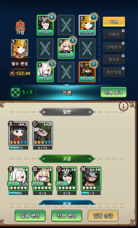 각 영웅마다 역할이 정해져 있고, 진영 배치에 따라 효과를 다르게 받을 수 있는데요. 스나이퍼, 프리스트, 위자드 등을 후방에 배치하고, 소드맨, 워리어 등을 전방에 배치하면 진형 효과로 인해 추가 보너스 스탯을 받을 수 있습니다.