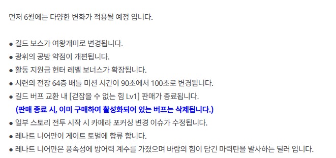 뿐만 아니고 이번에 광휘 공방 약점 개편, 활동 지원금 헌터 레벨 보너스 확장에