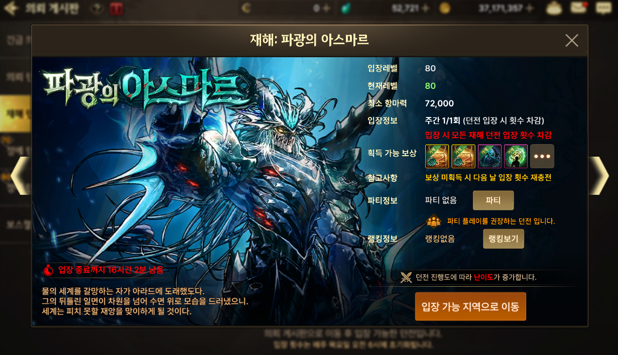 칼릭스 다음 재해던전으로 파광의 아스마르가 나왔어요