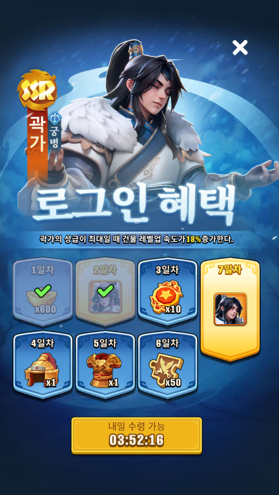 현재 7일 출석 이벤트 참여를 통해 다양한 보상을 받을 수 있는데요. ssr등급 초선과 곽가를 제공하니 잊지 말고 꼭 받아두도록 합시다. 외에도 여포 토벌, 전기의 경마 이벤트를 통해 추가 보상을 받을 수 있는데요. 단조석, 현철, 기본 재화 등 중요한 아이템을 대량으로 받을 수 있습니다.