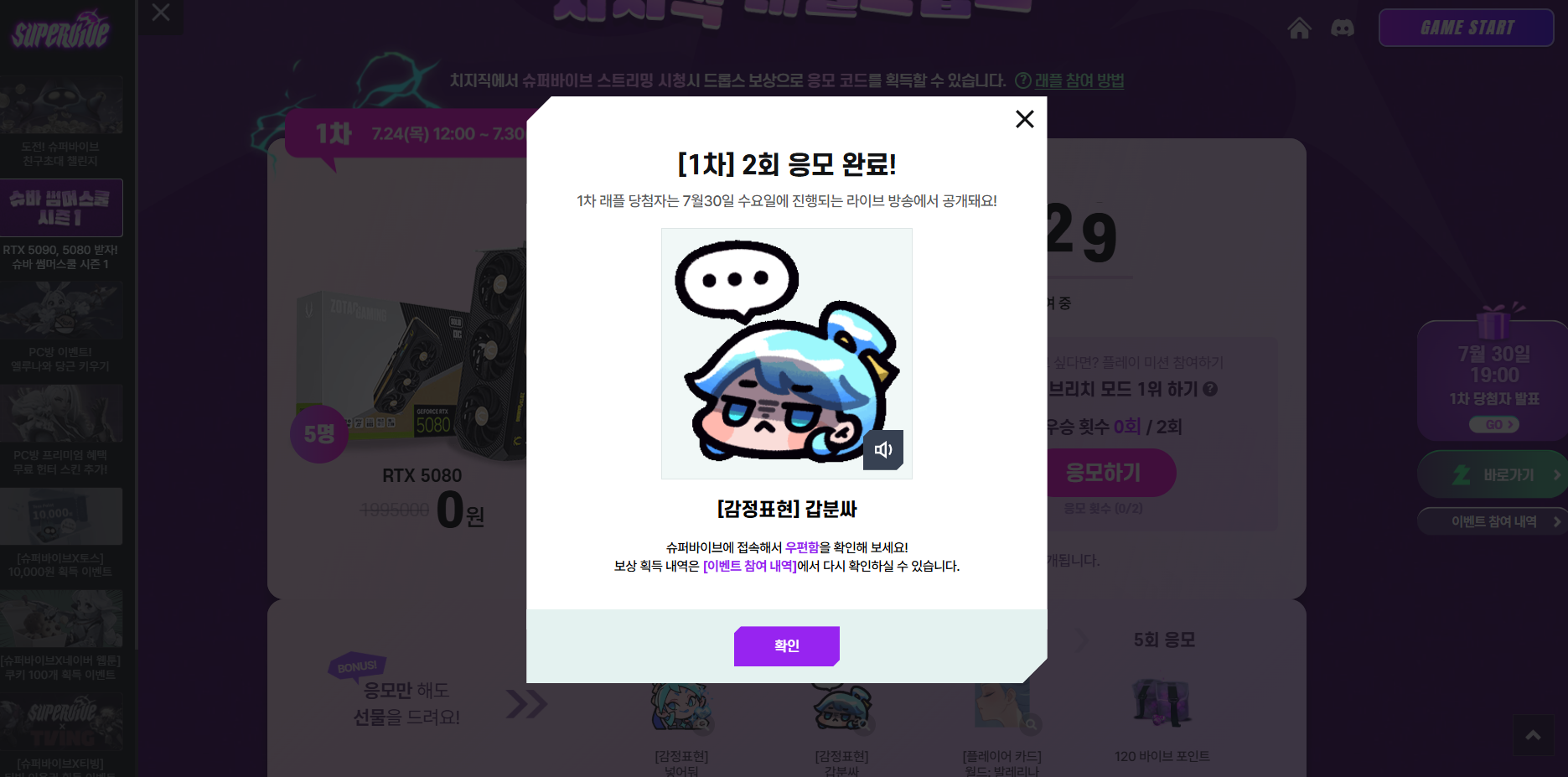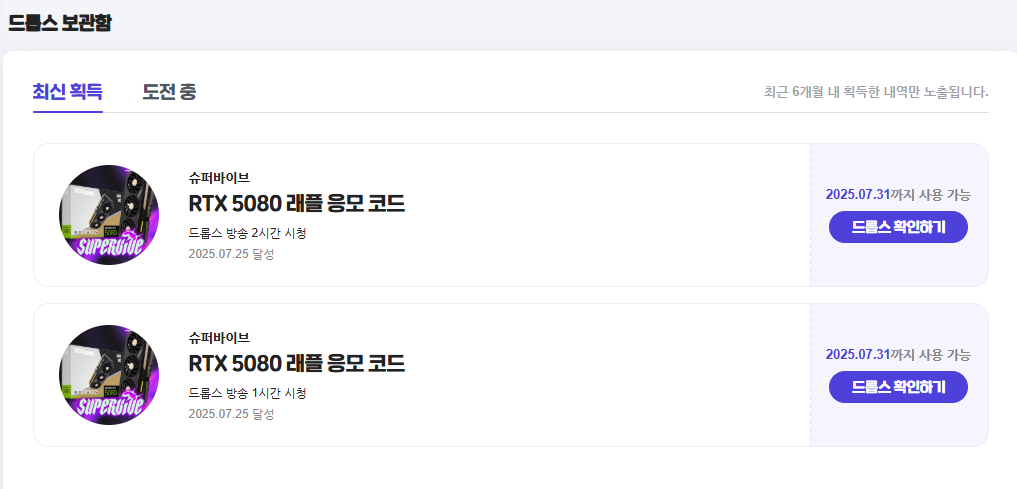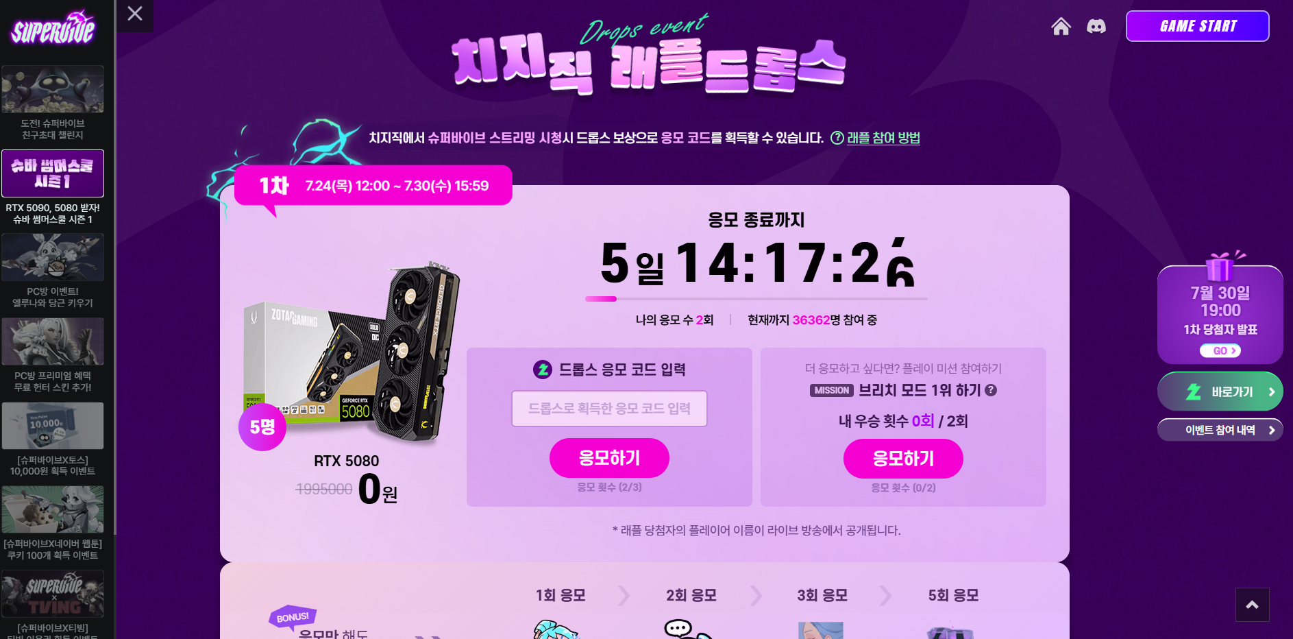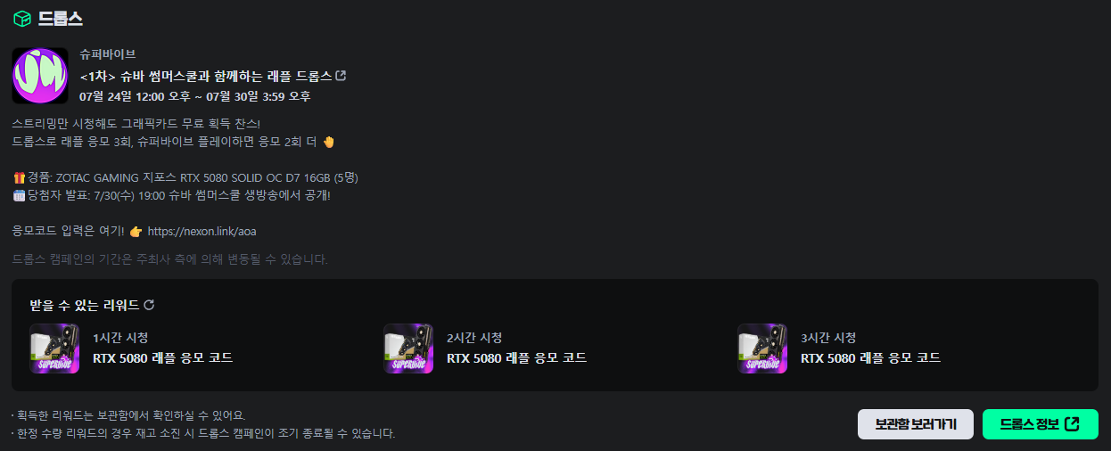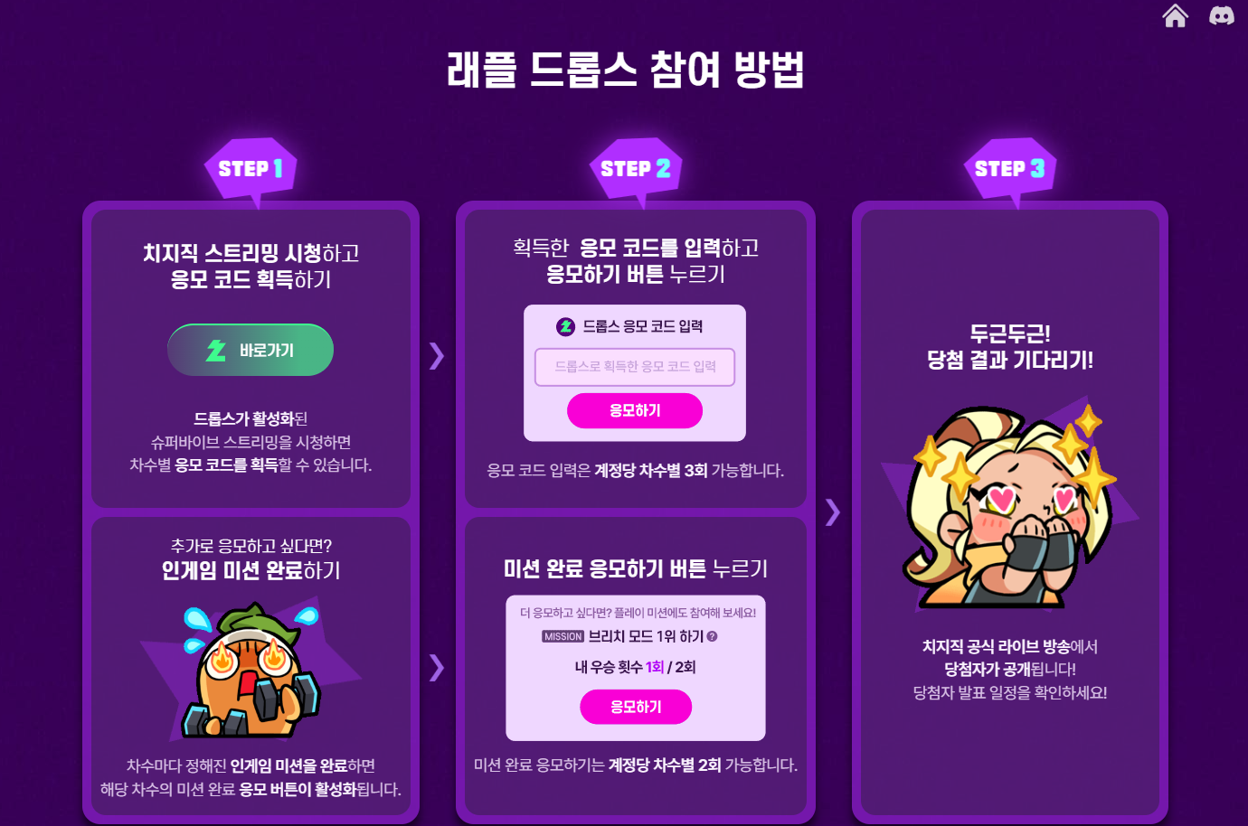 지금 슈퍼바이브에서 치지직 래플드롭스 이벤트를 진행 중인데