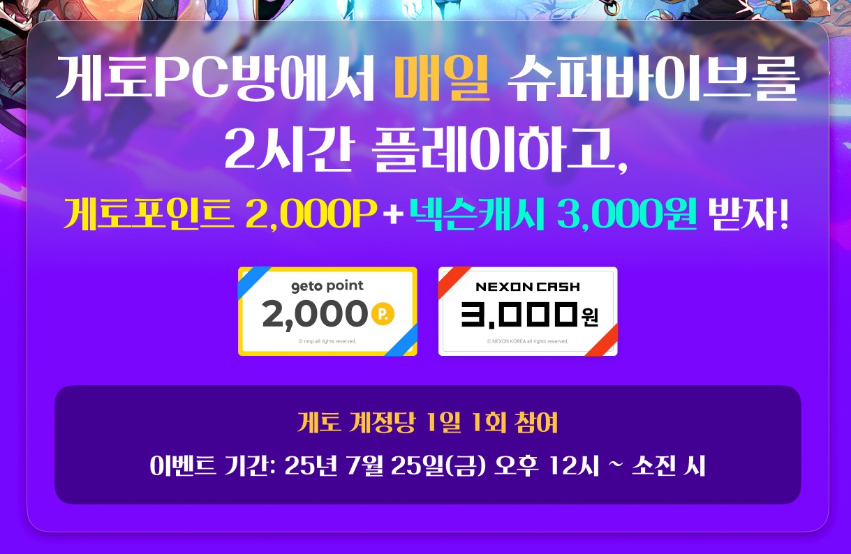 게토피시방 가서 매일 슈퍼바이브 2시간 플레이 하면 넥슨캐시 3000원 준대요