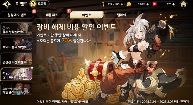 세나리 지금 장비 해체 비용 70% 할인 이벤트 떠서