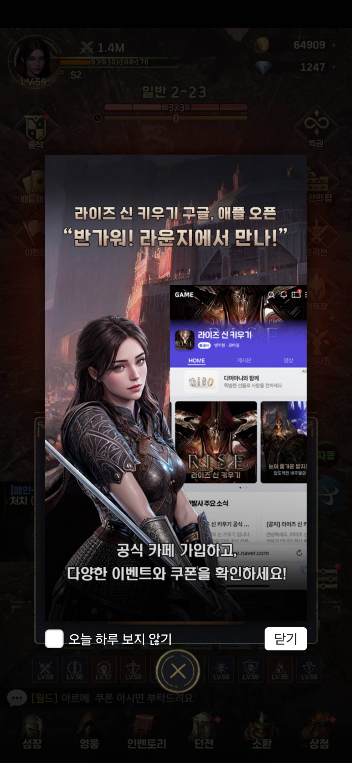 이외에도 다양한 이벤트가 진행 중이니 자세한 사항은 공식 카페 참고하시길 바라며 고퀄리티의 방치형 게임을 하고 싶으신 분들은 이번 기회에 찍먹해보시길 강추 드립니다 :)