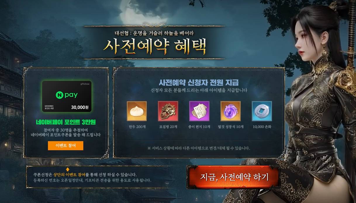 사전예약 보상으로 만두 200개, 모집령 20개, 종이 편지 10개, 탈것 성장석 10개, 10,000은화도