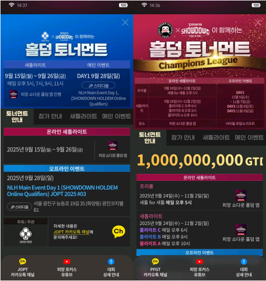 오른쪽은 PFGT X 피망쇼다운홀덤 토너먼트 챔피언스 리그인데