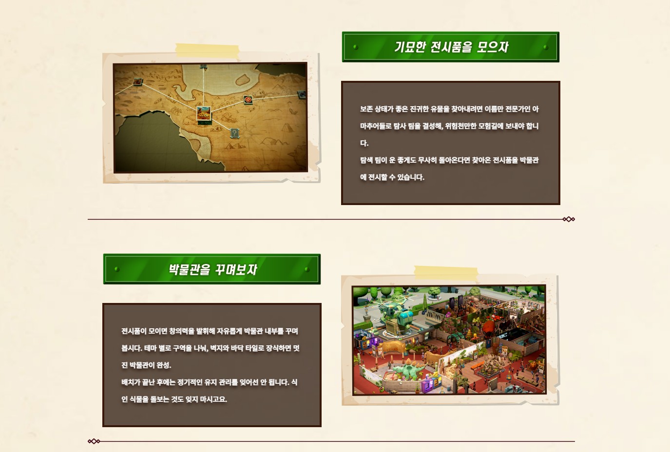 투 포인트 뮤지엄의 핵심 재미는 희귀한 전시품을 수집하는 컬렉션과 이를 활용해서 박물관을 운영하는 경영의 조화에 있습니다 . 유저는 큐레이터가 되어서 탐사대를 위험한 모험지로 파견하거나 공룡 뼈, 유령, 기묘한 유물 등 다양한 전시품들을 발굴하게 되는데 파츠를 모아 완성하고 등급이 나뉘는 유물들은 수집욕구를 자극하기도 하네요.
