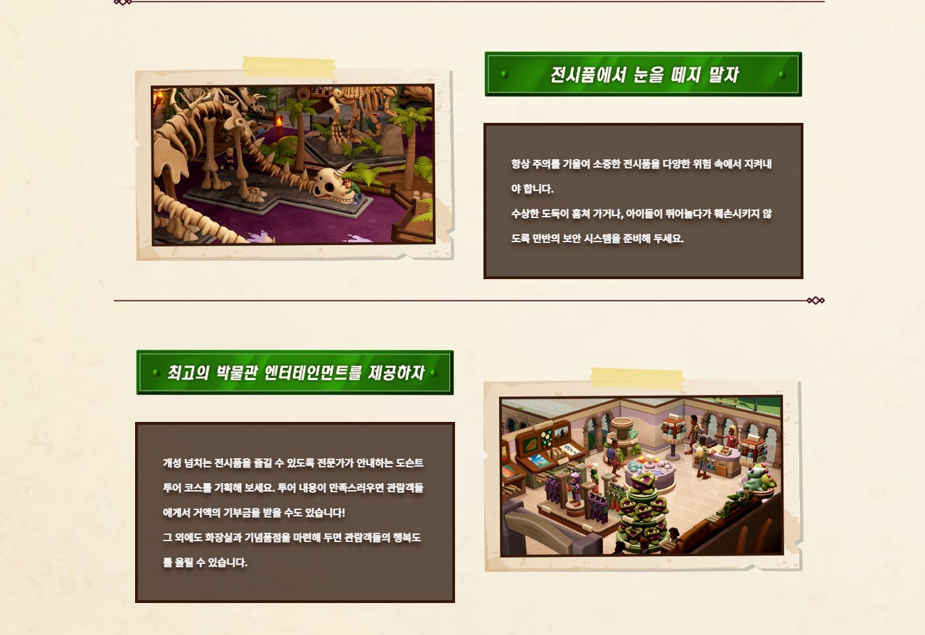 여기에 관람객의 동선이나 전시품 배치, 테마 꾸미기 등 창의성을 발휘해야하는 요소들도 가득한데다 도슨트 투어 기획, 식인 식물 관리, 도둑 방지 시스템 구축까지 신경써야 하는 등 지루할틈 없이 끊임없는 동기부여가 제공된다고 하니 참고하시면 좋을 것 같습니다.
