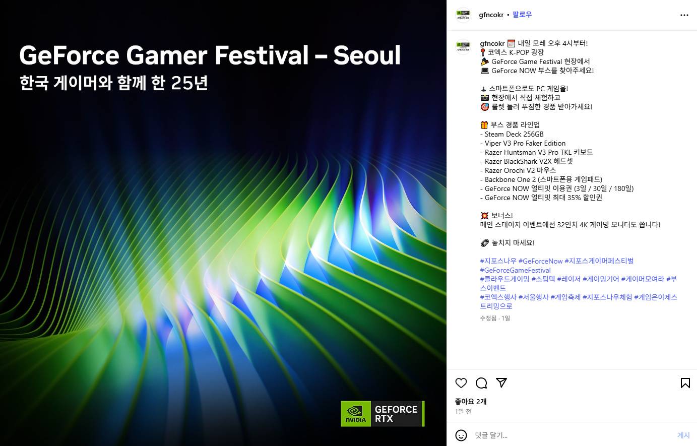 지포스나우 엔비디아가 주최하는 지포스 게이머 페스티벌 참가하더라구요?